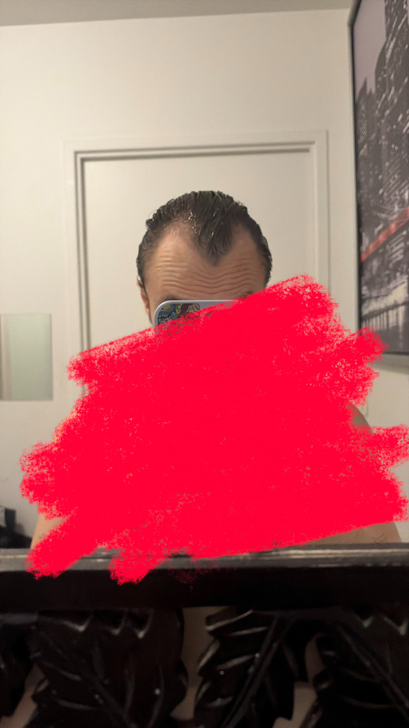 Now I’m wondering if I should actually start the treatment or if my hair loss isn’t that bad yet. I’ve learned that I’m supposed to apply minoxidil to my whole scalp except where I put finasteride. I think I should use finasteride only on my hairline, but I’m not sure if I should apply it only right along the hairline or also further back into the frontal area. I also know that for some people finasteride and minoxidil don’t work, and can even make them lose more hair. Right now, when I brush my hair or take a shower, there’s basically no hair on my comb or in the drain.