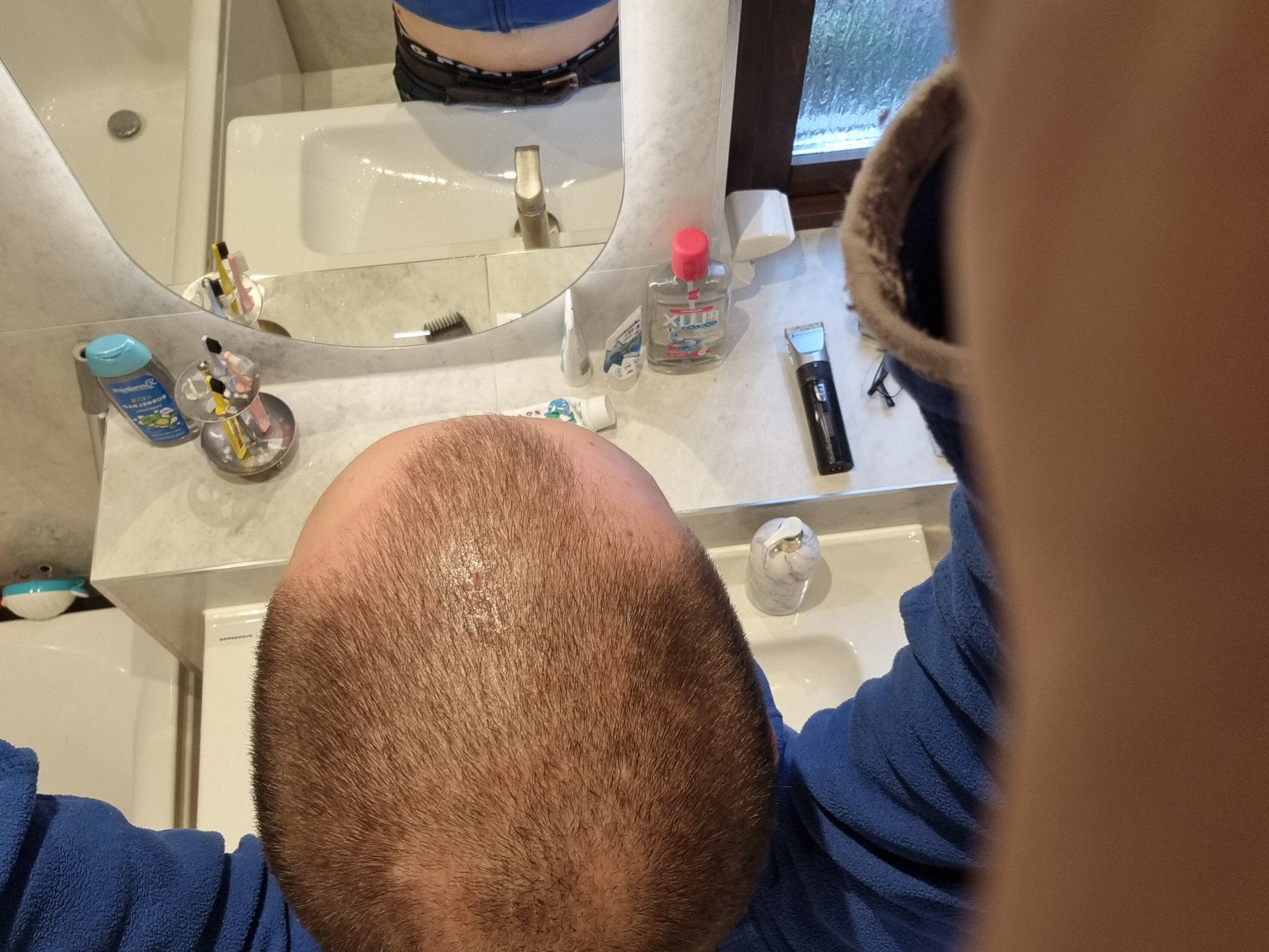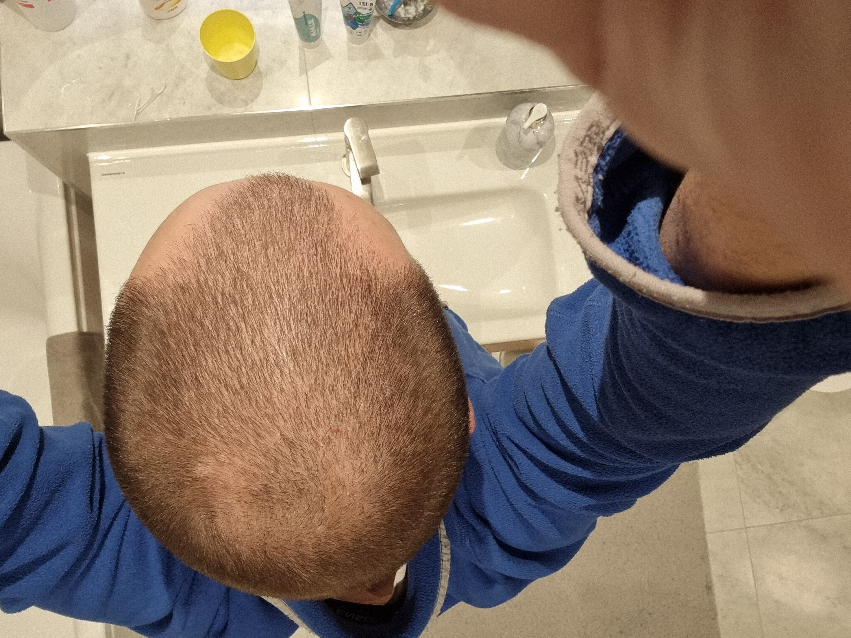 Temples are already starting to look better. Buzzing it down to same length before taking pictures.